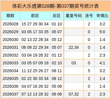 体彩大乐透第26037期奖号为:07、12、13、28、32 + 06、08,前区奇偶比为2:3,连码开出12,13,重号开出07,32。